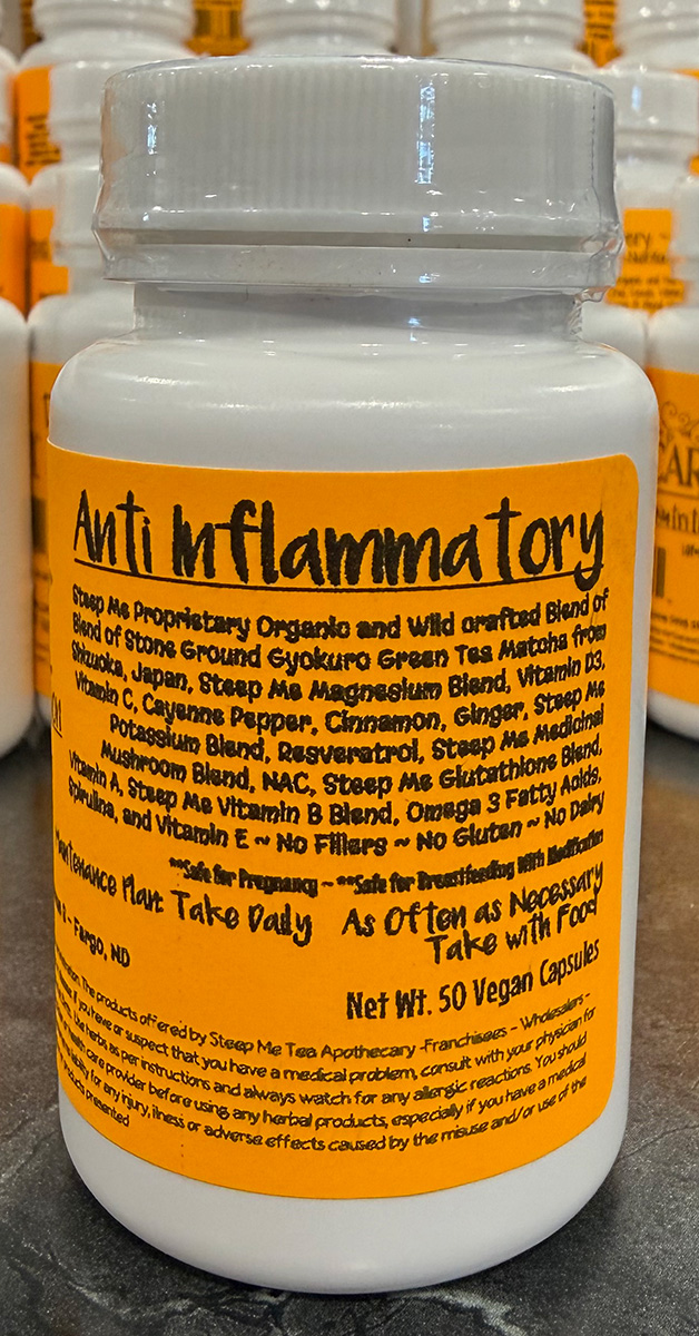 Steep Me Medicinal Mushroom Blend was added because it has bioactive components, such as beta-glucans and ergothioneine, that exhibit potent anti-inflammatory activities. Beta-glucans, a polysaccharide found in medical mushrooms, are known for their ability to modulate the immune response, helping the body fight against diseases. Ergothioneine, another bioactive component, is an antioxidant that helps protect cells in the body from damage. In addition to beta-glucans and ergothioneine, edible mushrooms also contain phenolic compounds, another group of bioactive compounds. These phenolic compounds also contribute to the anti-inflammatory activity of mushrooms. N-Acetylcysteine (NAC) was added because it is a compound made from one of the building blocks of protein, known as the amino acid L-cysteine, which is suggested to have antioxidant functions. One of NAC’s primary roles in the body is to function as a precursor to glutathione. Glutathione is a powerful antioxidant that is known to combat oxidative stress. When glutathione is depleted, researchers believe the body might be more susceptible to chronic inflammation and disease progression. Next, we included Steep Me Glutathione Blend. Steep Me Glutathione Blend is a thiol antioxidant, which helps your body regulate immunity. It has a significant role to play in reducing inflammation in the lungs specifically fights against free radical damage, glutathione provides immense anti-inflammatory relief to the body. Vitamin A was included because deficiency can increase infection risk and getting enough vitamin A can keep your immune system from being overactive and causing inflammation. Steep Me Vitamin B Blend was added because it can reduce inflammation in the body. B vitamins can lower C-reactive protein and homocysteine, positively impacting outcomes like cardiovascular disease and autoimmune conditions. Omega-3 fatty acids were included because they have been shown to have anti-inflammatory effects. Spirulina because it has strong antioxidant effects, it helps reduce inflammation, promotes healthy aging, and may strengthen the immune system. Spirulina has strong antioxidant effects and has been shown that it helps reduce inflammation, promote healthy aging, and may strengthen the immune system. And finally, we added Vitamin E. Vitamin E is an antioxidant vitamin that provides huge boosts to your inflammatory relief. Vitamin E is highly crucial to your body’s ability to heal.