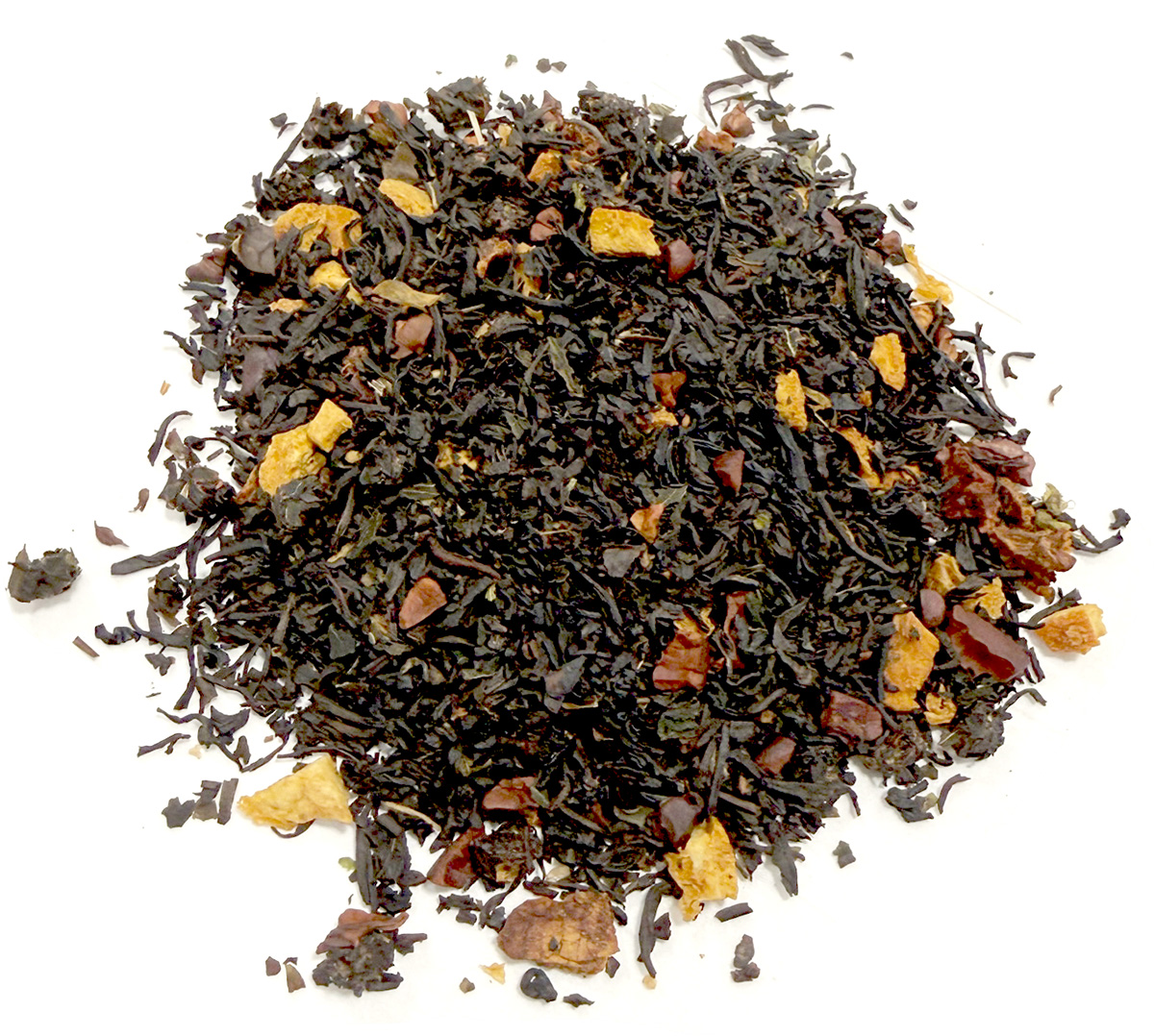 Besides the usual ingredients of Earl Grey, in this blend we added Cacao Nibs and Dark Chocolate 72% Cacao Mini Chips giving it a very Chocolate & Orange Taste. Then we added in the traditional High Quality Bergamot Oil giving it an Earl Grey -Ness but rich in Chocolate.  Check it out…a fun addition to your Earl Grey collection.