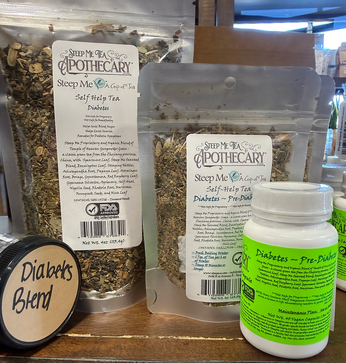 Steep Me Self-Help Tea combinations are a wonderful way to get health benefits outside of the standard tea leaf. This combination of herbs helps the body balance blood sugars and other ancillary side effects that can come with diabetes diagnosis. This blend will also help with overall body circulation, respiratory health, and capillary volume. There are herbs included to help slow the breakdown of carbs, increase health of the immune system, and help to moderate the glucose and insulin processes. What is Diabetes? Diabetes is a condition where your blood sugar (glucose) levels are too high. Glucose is an important source of energy for the cells that make up the muscles and tissues. It is also the brain’s main source of fuel. It occurs when either your pancreas does not produce enough insulin, or your body becomes unresponsive to insulin’s effects. Insulin is a hormone that helps regulate blood sugar by allowing it to enter cells for energy. The main cause of diabetes varies by type. But no matter what type of diabetes you have, it can lead to excess sugar in the blood. Too much sugar in the blood can lead to serious health problems. Chronic diabetes conditions include type 1 diabetes and type 2 diabetes. Diabetes – Symptoms and causes – Mayo Clinic What is Pre-Diabetes? Prediabetes is diabetes in evolution. Prediabetes is a health condition characterized by higher-than-normal blood sugar levels that are not yet high enough to be classified as type 2 diabetes. It serves as a critical warning sign, indicating an individual’s heightened risk of progressing to diabetes if effective measures are not implemented to manage blood glucose levels. Unlike people with Type 1 diabetes who go directly into the stage of diabetes, most people with type 2 diabetes pass through this stage. Prediabetes develops primarily through a mechanism known as insulin resistance, where the body’s cells become less responsive to insulin, a hormone required for glucose uptake. As a result, the pancreas compensates by producing more insulin, which can exhaust its ability to maintain normal blood sugar levels. Several underlying factors contribute to the development of insulin resistance and subsequently prediabetes. Additionally, certain metabolic syndromes, characterized by a combination of elevated blood pressure, abnormal cholesterol levels, and increased waist circumference, further increase the risk of prediabetes and related complications. Without proper intervention, individuals with prediabetes can progress to type 2 diabetes, which carries a slew of health risks, including cardiovascular disease, nerve damage, kidney issues, and vision problems. Insulin resistance, combined with some degree of insulin deficiency, is the hallmark of the prediabetes stage. Managing insulin sensitivity and blood sugar levels is vital to prevent the progression from prediabetes to diabetes.