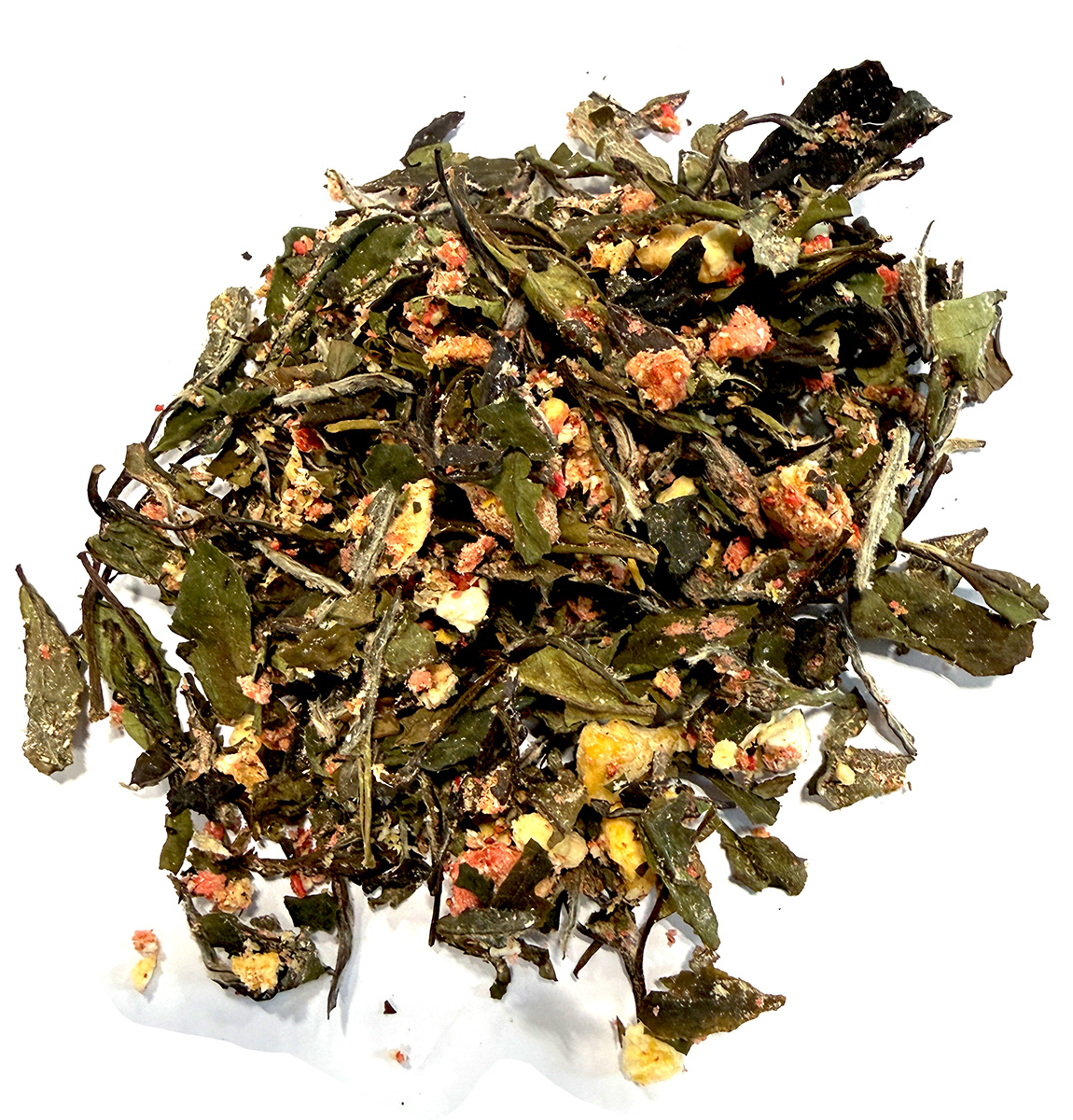Ingredients: Steep Me Proprietary and Organic Blend of Pai Mu Tan Chinese White Tea (Chinese White with 2 leaves) with Freeze-Dried Strawberry, Freeze-Dried Pineapple, Fuji Apple Bits, and Freeze-Dried Peaches with Highest Quality Strawberry & Peach Essential Oil