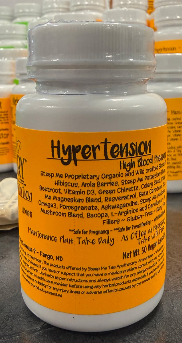 Steep Me Micro-Nutrition combinations are a wonderful way to get health benefits from different combinations of Vitamins and Minerals. With this blend we are providing a healthy and potent blend of minerals and vitamins for managing hypertension or high blood pressure. High blood pressure, or hypertension, affects 1 in 3 adults in the United States. When blood pressure is high, blood pushes too hard against the walls of your blood vessels, leading to heart disease, stroke, and even an increased risk of death. High blood pressure is the most preventable cause of heart disease. While medications are often prescribed, nutrition and exercise are important lifestyle measures that can help; interestingly, certain herbs and supplements may too. What is Hypertension? The diastolic pressure (lower number) is the resistance to the blood flow in the blood vessels between heartbeats when blood is pumped around your heart. They are both measured in millimeters of mercury (mmHg). As a general guide: high blood pressure is considered to be from 140/90mmHg or more if your reading was taken at a pharmacy, GP surgery or clinic (or an average of 135/85mmHg if it was taken at home) ~ if you’re over the age of 80, high blood pressure is considered to be from 150/90mmHg or more if your reading was taken at a pharmacy, GP surgery or clinic (or an average of 145/85mmHg if it was taken at home) ~ ideal blood pressure is usually considered to be between 90/60mmHg and 120/80mmHg, while the target for people over the age of 80 years old is below 150/90mmHg (or 145/85mmHg if it was taken at home). Blood pressure readings from 121/81mmHg to 139/89mmHg could mean you are at risk of developing high blood pressure if you do not take steps to keep your blood pressure under control. Everyone’s blood pressure will be slightly different. What is considered low or high for you may be normal for someone else. If your blood pressure is too high, it puts extra strain on your blood vessels, heart, and other organs, such as the brain, kidneys, and eyes. Persistent high blood pressure can increase your risk of a number of serious and potentially life-threatening health conditions, such as heart disease ~ heart attacks ~ strokes ~ heart failure ~ peripheral arterial disease ~ aortic aneurysms ~ kidney disease ~ vascular dementia. If you have high blood pressure, reducing it even a small amount can help lower your risk of these health conditions. It is not always clear what causes high blood pressure, but there are things that can increase your risk. You might be more at risk if you ~ are overweight ~ eat too much salt and do not eat enough fruit and vegetables ~ do not do enough exercise ~ drink too much alcohol or coffee (or other caffeine-based drinks) ~ smoke ~ have a lot of stress ~ are over 65 years old. Making healthy lifestyle changes can sometimes help reduce your chances of getting high blood pressure and help lower your blood pressure if it is already high. High blood pressure (hypertension) – NHS (www.nhs.uk)
